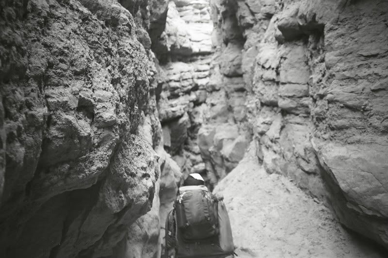The sun-baked rocks made it certain that it was still warm well after sundown. We hiked in search of a nice place to set up camp. We came across these tiny oval caves providing some type of shelter from the intrepid weather. We would later realize that these caves would trap the heat so everybody scooted out of their holes to bask in the cool of darkness. The black of the night was tattered by headlamps.